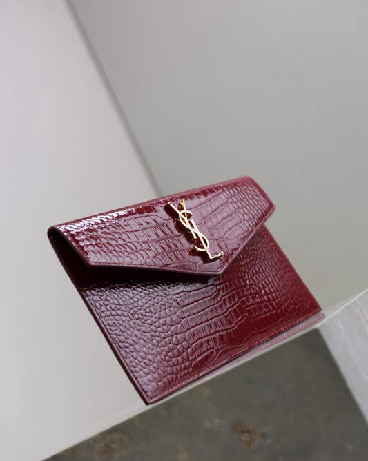 Saint Laurent Uptown Clutch – Croc-Embossed in Burgundy Brand New